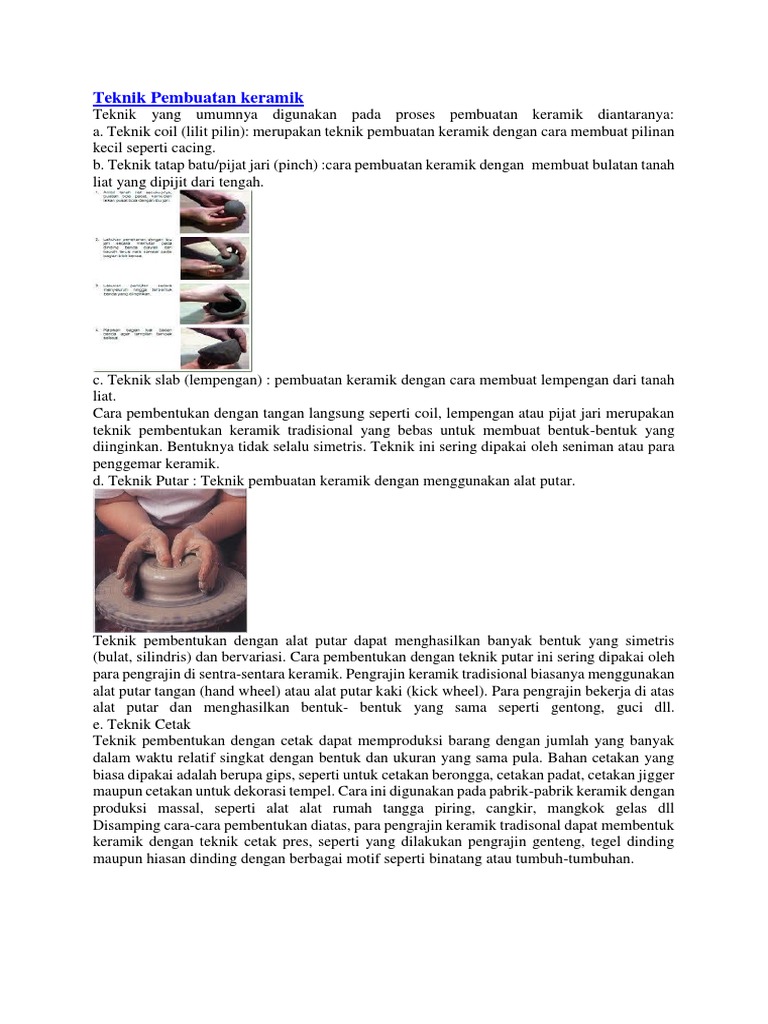 Proses Pembuatan Keramik Dan Teknik Pembentukannya Kumparan Com from blue.kumparan.com Keramik merupakan salah satu jenis bahan membuat kerajinan yang sangat cocok, karena bahannya yang sudah terlihat estetis walaupun belum diolah menjadi sebuah kerajinan. Jan 28, 2021 · sebutkan persyaratan tanah yang baik untuk membuat keramik. Feb 27, 2021 · di bawah ini, kami akan memberikan informasi tentang sebutkan 5 teknik dalam pembuatan kerajinan keramik. Kerajinan keramik ini perlu untuk selalu dilestarikan, agar menjadi budaya yang mengharumkan negara kita di kancah internasional. Spar77.de has been visited by 100k+ users in the past month Diposting oleh jengwati2 on rabu, 20 agustus 2014 label: Teknik industri bab i pendahuluan 1.1 latar belakang keramik merupakan senyawa unsur logam dan bukan logam, kebanyakan keramik adalah isolator akan tetapi beberapa diantaranya memiliki sifat semikonduktivitas yang mempunyai nilai teknis. Teknik pijit tekan (pinch) adalah teknik pembentukan badan keramik secara manual.